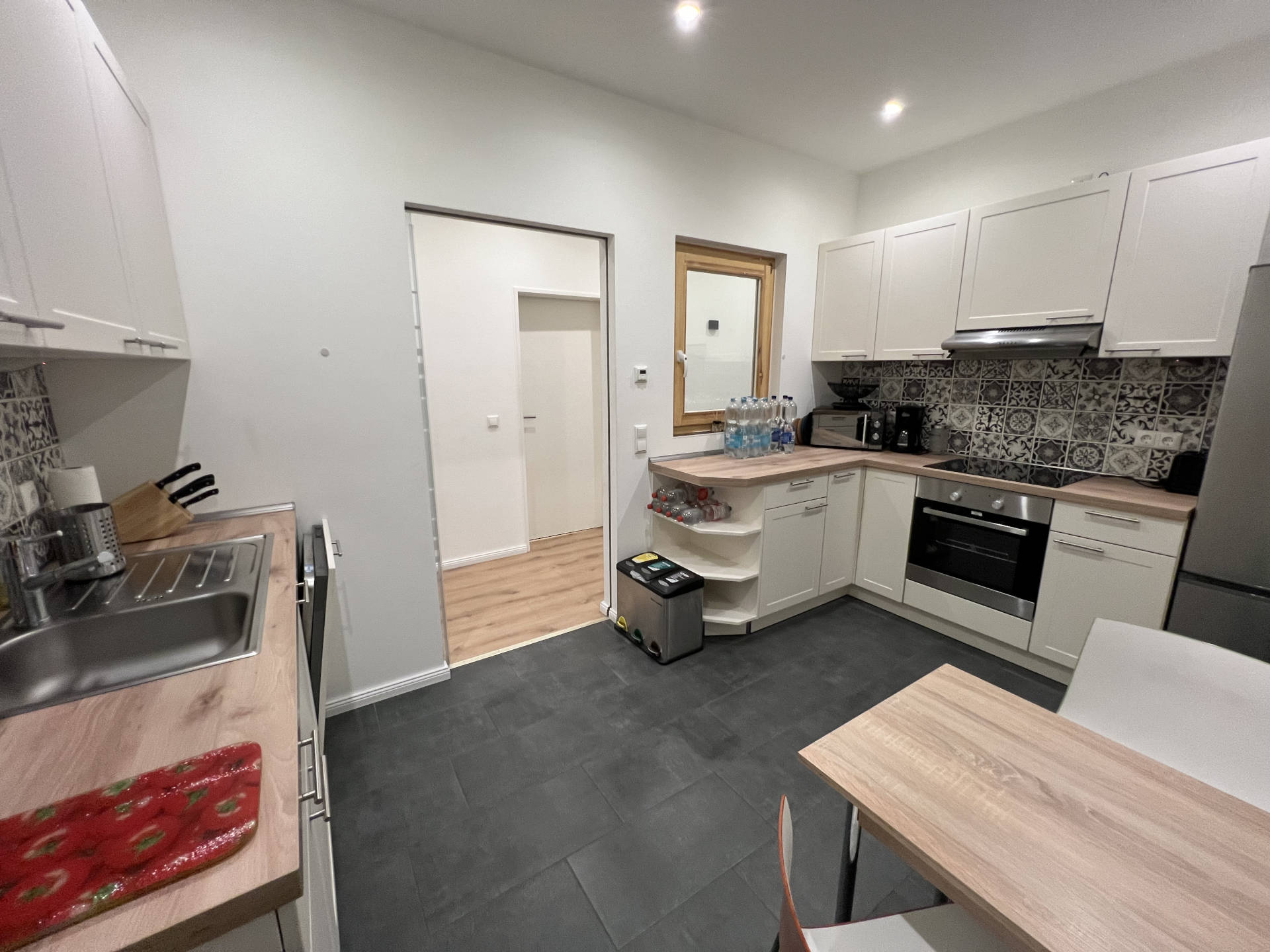 Mikrowelle, Gefrierschrank, Geschirrspülmaschine, Elektroherd, Backofen, Wasserkocher, Kaffeemaschine, Toaster, Grillbesteck